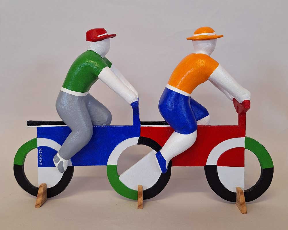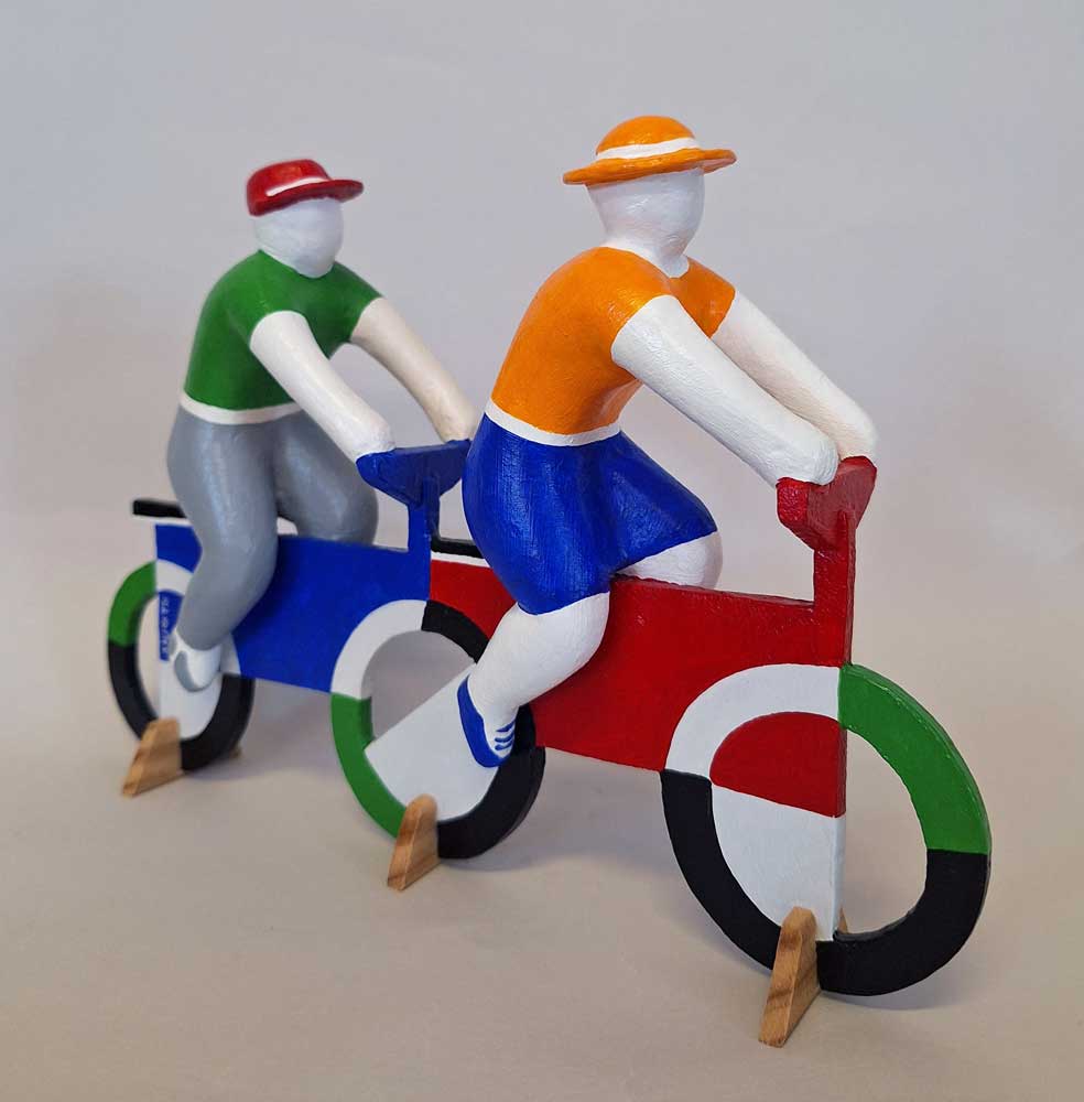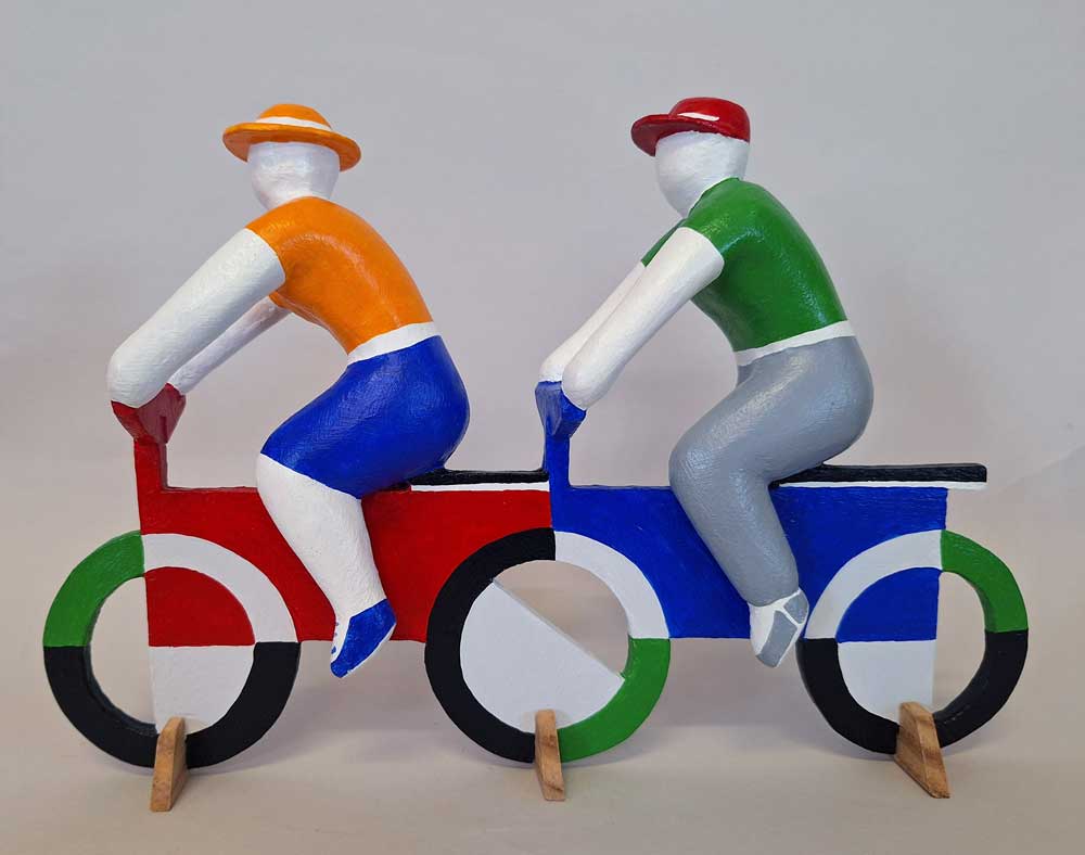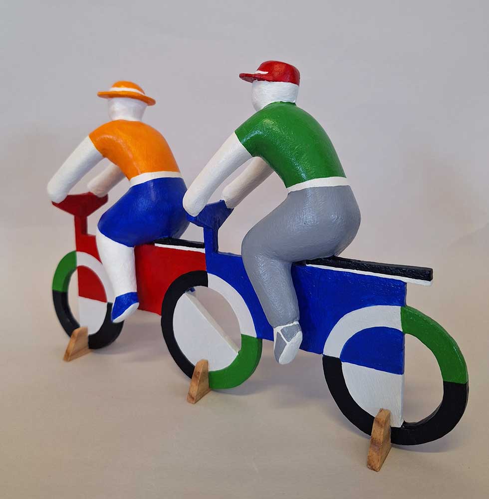 Figura de dos ciclistas en tándem realizada de forma artesanal en cartón piedra y duolite. Pintada a mano en acrílico y barnizada. Diseños propios y personalizados.